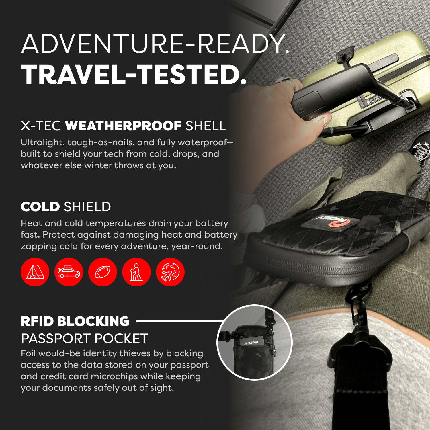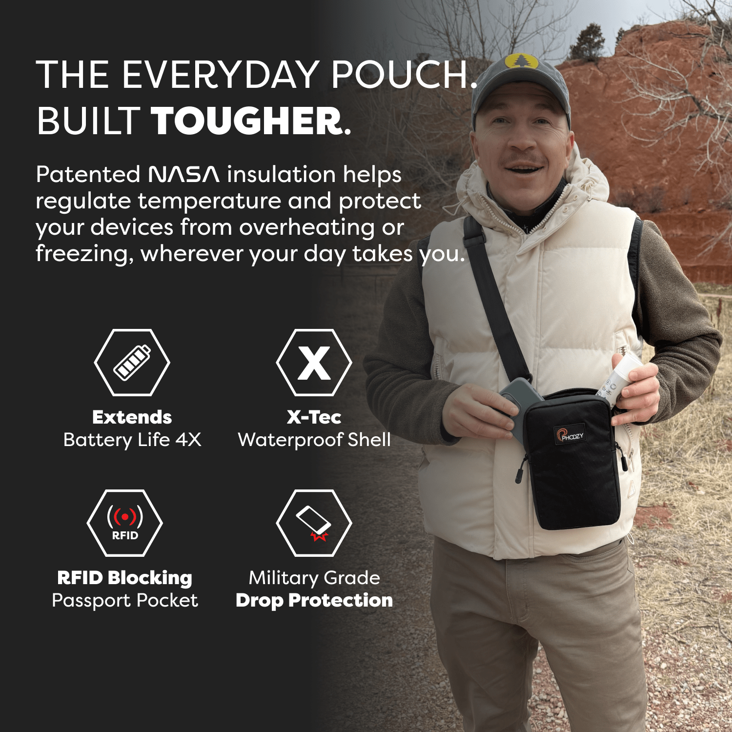 The Ultimate Adventure Travel Pouch. Lightweight, rugged, climateproof, and secure for every day carry and protection of your essentials. Fits any size phone with room for your charging cords, credit cards, passport, sunglasses and other every day carry items.